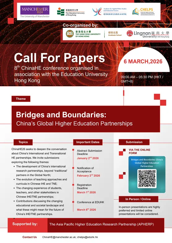The event is co-organised by the Manchester Institute of Education, University of Manchester and the Centre for Higher Education Leadership and Policy Studies, The Education University of Hong Kong, with support from the Graduate School of The Hang Seng University of Hong Kong, Lingnan University, and the Asia Pacific Higher Education Research Partnership (APHERP).The conference gathers scholars, practitioners, and students to discuss developments in Chinese and global higher education.
